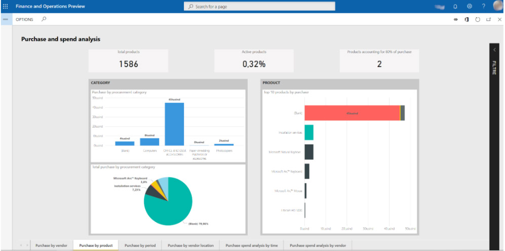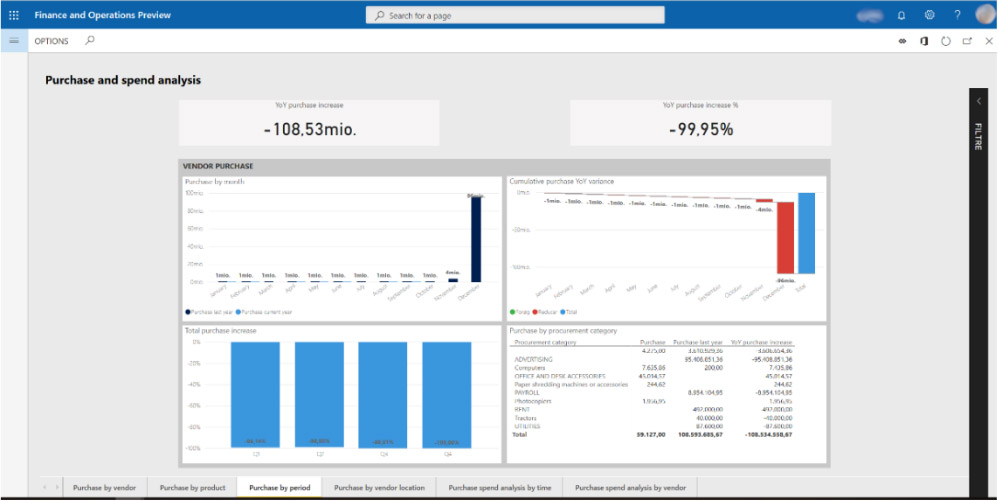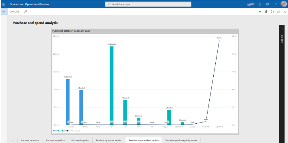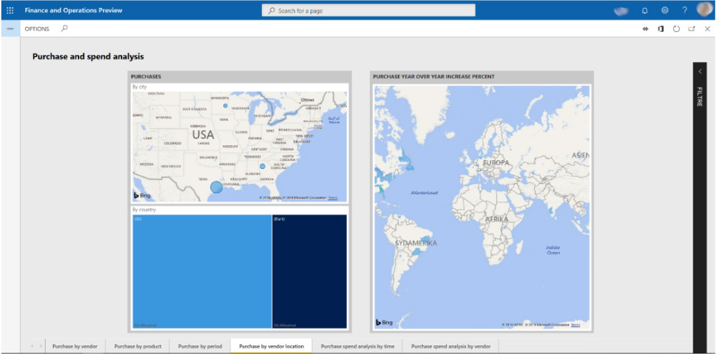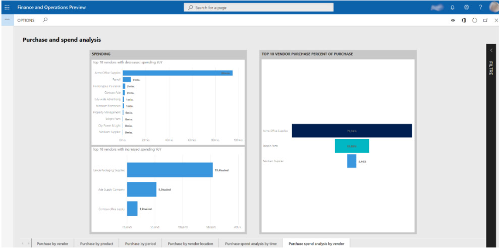 A análise de gastos de compra do power BI está disponível na página de Análise de Compra e Gasto (compras > consultas e relatórios > análise de desempenho de compra > Análise de compra e de gastos).