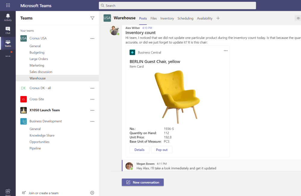 • O Microsoft Dynamics 365 Business Central conecta seus funcionários às ferramentas de que eles precisam, oferecendo insights acionáveis a partir de visibilidade em tempo real entre equipes e departamentos.
