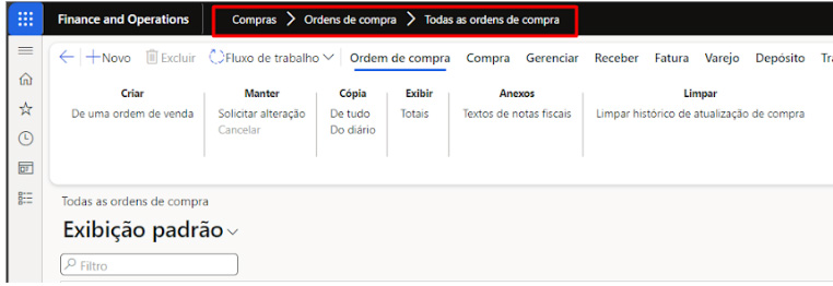 A barra de navegação herdada exibe a trilha de navegação para acessar um formulário, o que auxilia na compreensão da navegação no sistema. A Microsoft introduziu um parâmetro que permite ativar ou desativar essa funcionalidade em uma das atualizações do sistema. Para habilitá-la, siga os passos: acesse Administração do sistema > Segurança > Opções de desempenho do cliente e marque a opção “Habilitar a barra de navegação herdada”.