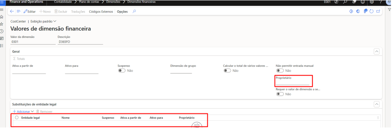 - Campo “Proprietário”: Selecione o funcionário responsável pela dimensão. Este colaborador será responsável pela gestão das dimensões em todas as entidades legais.