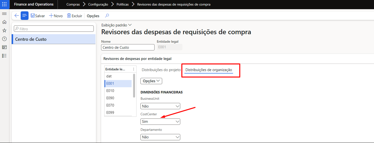- Distribuição de Organização: Na aba “Distribuição de organização”, selecione as dimensões que serão habilitadas para a política. A política pode ter regras distintas para cada entidade legal.