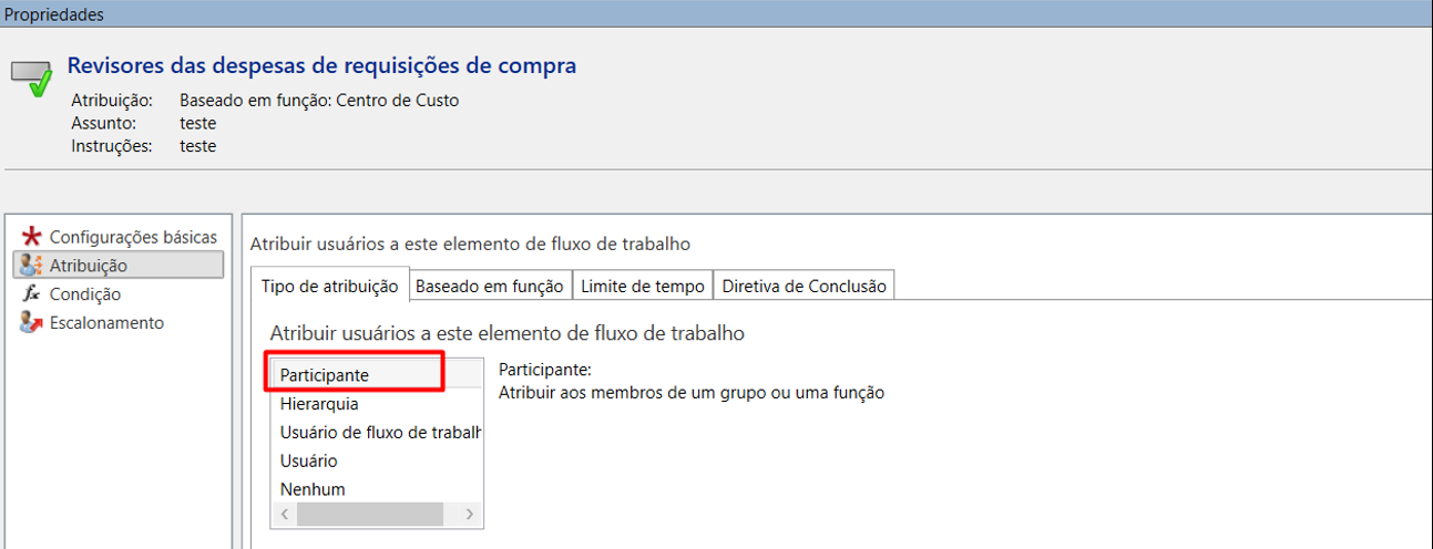 - Elemento “Aprovar Requisições de Compra”: Na “Atribuição”, selecione “Participante”.