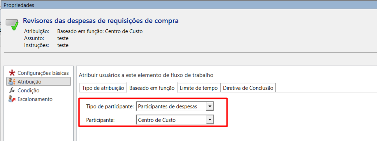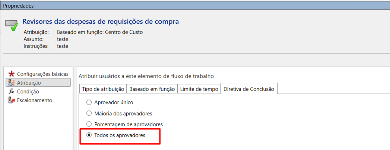 O último passo é configurar o Fluxo de Trabalho da Requisição de Compra para encaminhar a despesas ao proprietário da dimensão financeira.