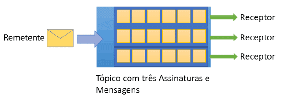 Também é possível usar tópicos para enviar e receber mensagens. Enquanto uma fila é frequentemente usada para comunicação ponto a ponto, os tópicos são úteis em cenários de publicação/assinatura.